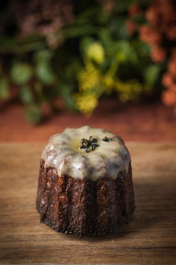 「黒糖ミルクウーロンの半熟カヌレ」は特殊な製法で発酵させたミルクの香りがする不思議なウーロン茶を生地に入れ焼き上げました。トッピングには黒糖のソースとミルクウーロンの茶葉を使用。黒糖のコクとの深み、ミルクウーロンの豊かで上品な香りが新しい組み合わせの大人カヌレです。
