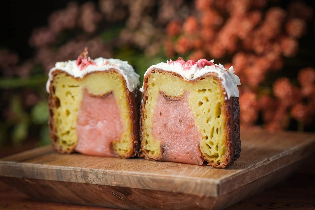桜フレーバーは、プレーン半熟カヌレの中にオリジナル桜餡を入れ、ホワイトチョコレートと塩漬けの桜をトッピング。和洋が融合した季節限定商品なので、ほんわりとした優しい桜の香りをご堪能ください。