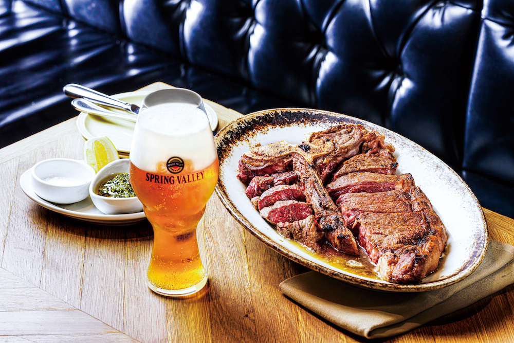 また、フードメニューには「おすすめペアリング」のマークがついているので、ビールに合う料理選びも簡単。ビールとの食べ合わせによって生まれる味のハーモニーを楽しむことができます。例えば、ホップの香りがしっかり立っていながらも程よい苦味の「豊潤496」には、お店の看板メニュー「Tボーンステーキ」がおすすめ。表面はカリッと香ばしく、中からジューシーな肉汁がしたたるステーキと、「豊潤496」の口に広がる麦のうまみがベストマッチ!クセになる味わいです。