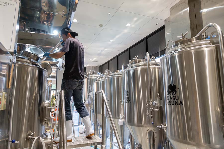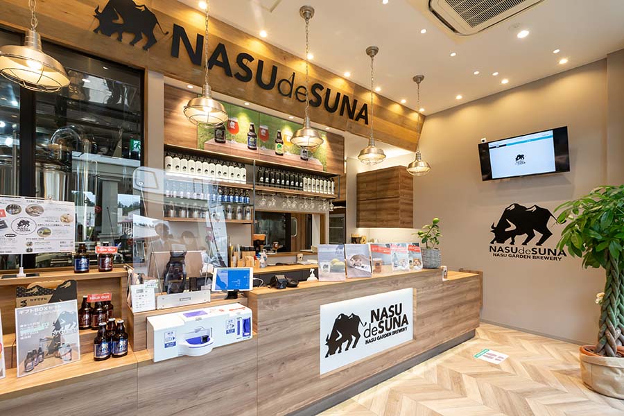 「那須ガーデンブルワリー NASU de SUNA(なすがーでんぶるわりー なすですな)」は、那須ガーデンアウトレット内にある、那須塩原市初のクラフトビール醸造所です。オープン以来、オリジナルブランドのクラフトビール「なすですな」は、連日売り切れるほどの人気ぶり。店内の窓から併設の醸造所をのぞくことができて、週1回ほど作業している様子も見られます。
