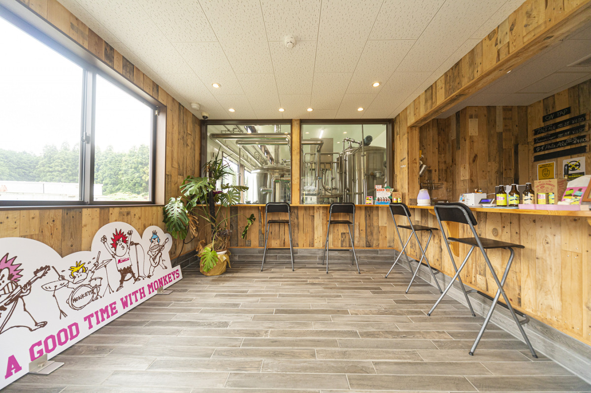 看板の立つ入口から入ると、店内は木目を生かしたおしゃれなタップルームになっていて、ガラス越しに醸造設備が並んでいる様子も見られます。もっとがっつり見学したい!という方は事前に電話予約すれば、無料で工場内を案内していただくことも可能です。