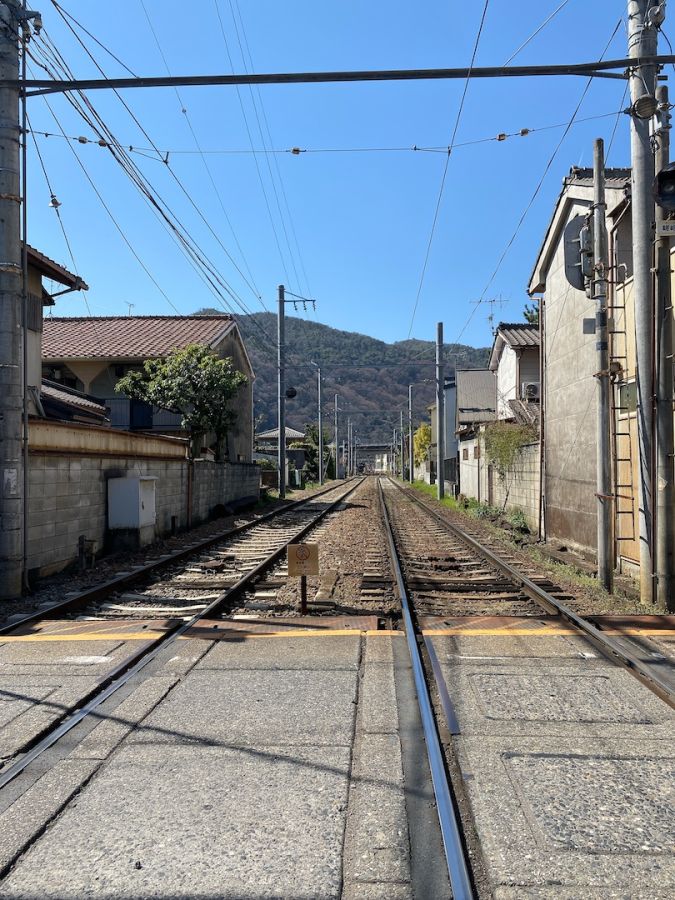 全国的にも数少なくなった路面電車。このノスタルジックな風景のすぐそばに、古い銭湯をリノベーションした人気のカフェ「嵯峨野湯」はあります。