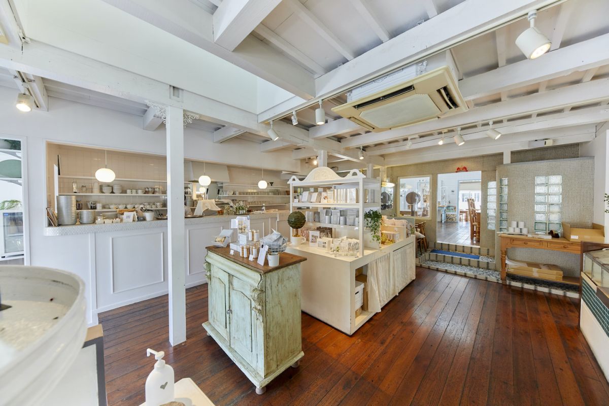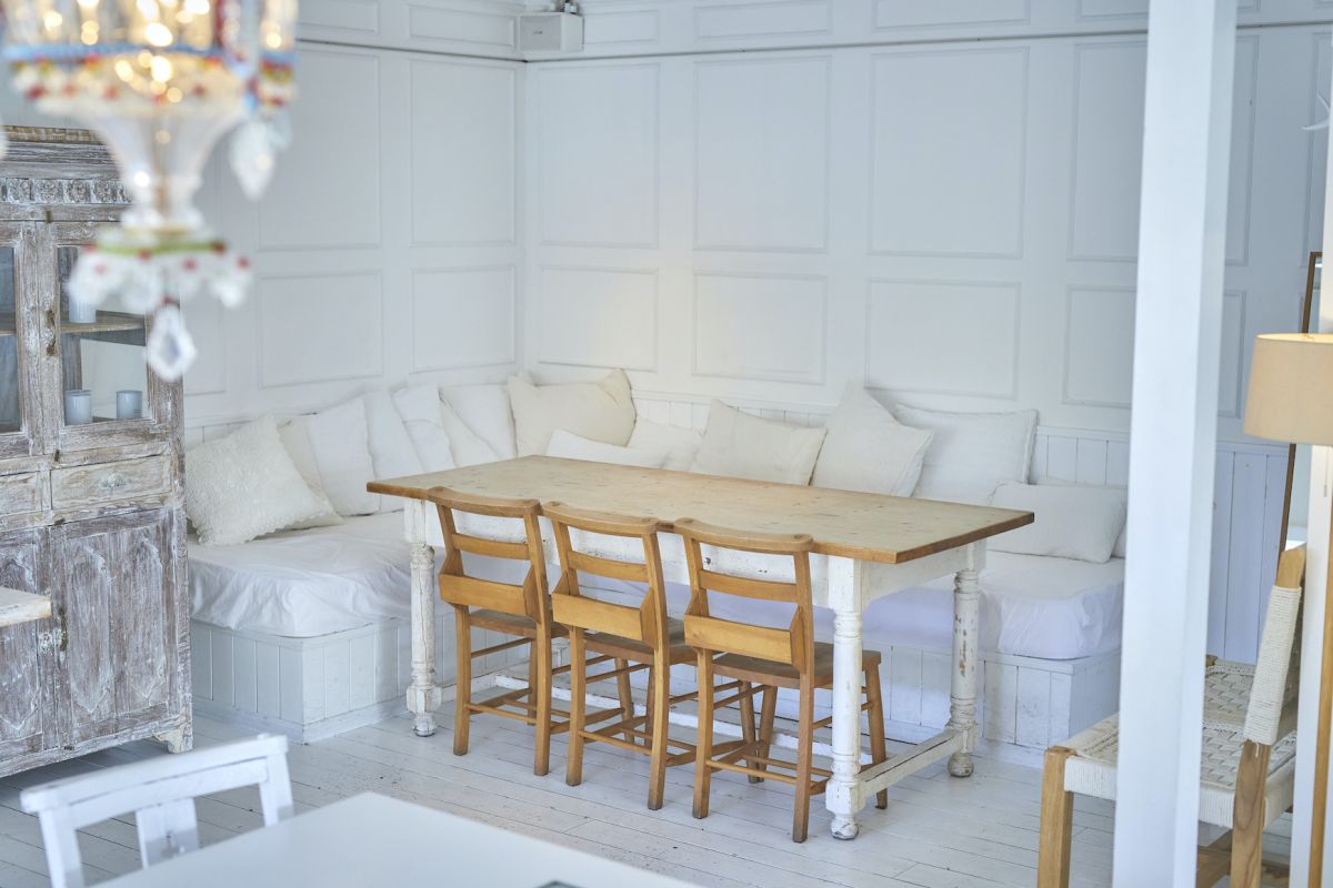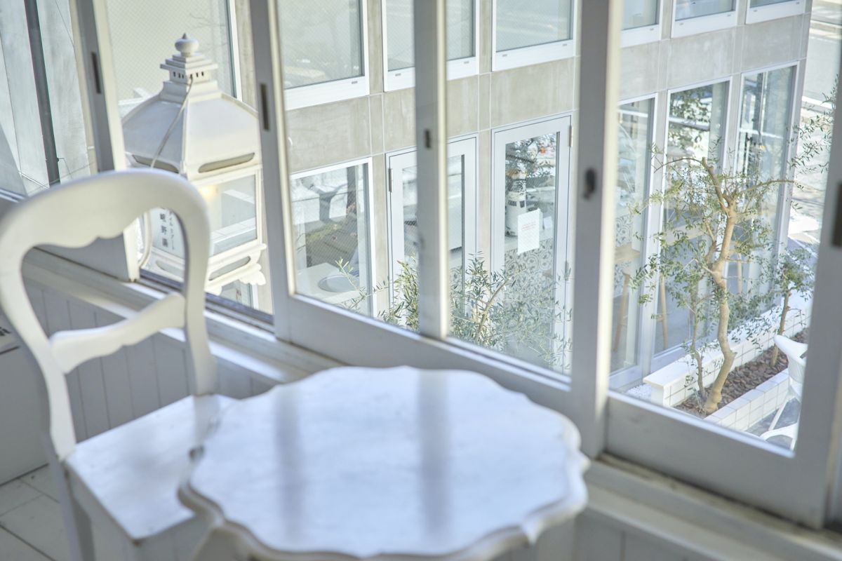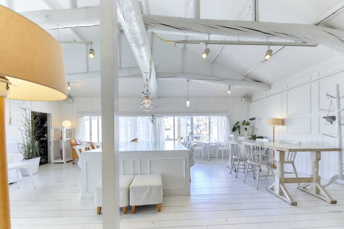 2階はといえば、もともとは住居スペースだったそう。天井の剥き出しになった梁も床も白く塗り、テーブルや椅子などの家具もすべてが真っ白で統一されています。