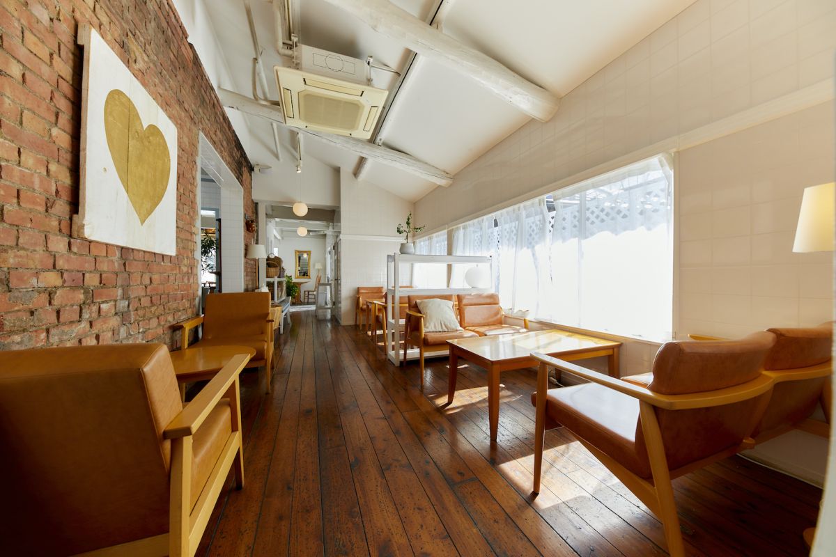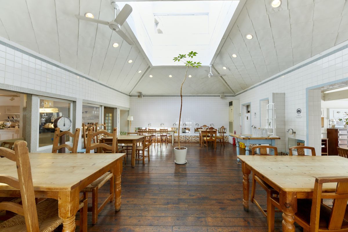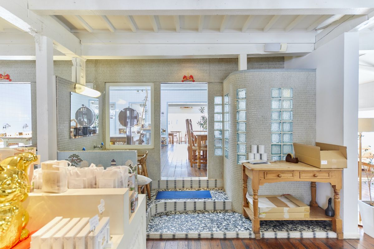 テラス席を通り過ぎ、扉を開けると奥行きのある広々とした店内。かつては番台があり、左右に分かれて男女の脱衣場のあった場所は物販スペース、奥の風呂場部分がカフェスペースになっています。