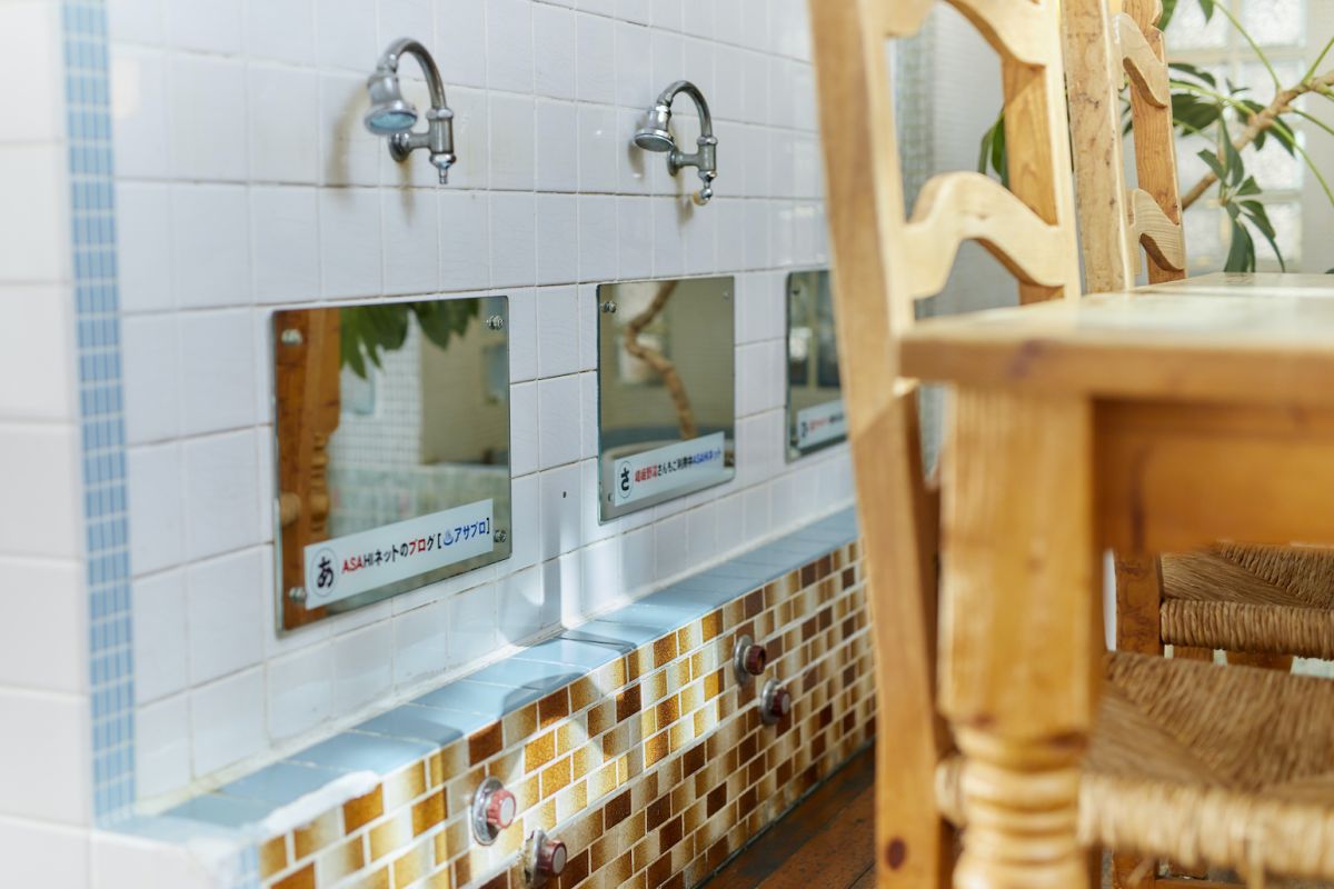 近づいてみると両サイドの壁には洗い場のカランと鏡が当時のまま残されています。真っ白なタイルもリノベーションされたものではなく、当時のまま。つるつるに磨かれて、清潔に光り輝きます。