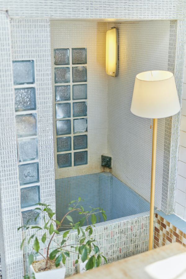 店内に残る銭湯の面影をご紹介。上がり框(がまち)の玉石タイル、光を透過するガラスブロック、曲線の柱を覆う細長いモザイクタイル、タイル絵。店内を巡るのが、大正ロマンを探す宝探しのよう。