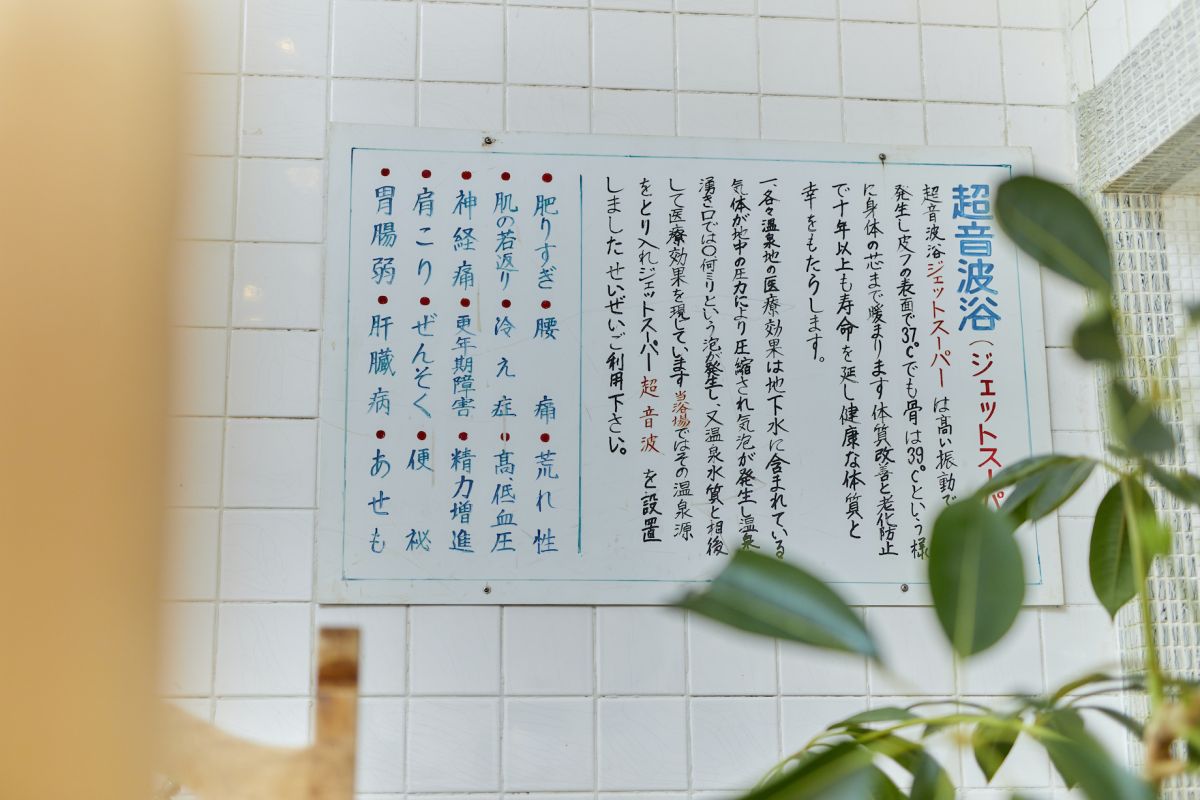 壁に並ぶシャワーとカラン、アナログな体重計。左右の隅にあるのは水風呂、番号がわかりやすい貴重品入れ。超音波浴の注意書きにある「十年以上も寿命を延し」「せいぜいご利用下さい」の説明もおおらかでちょっぴり笑えます。