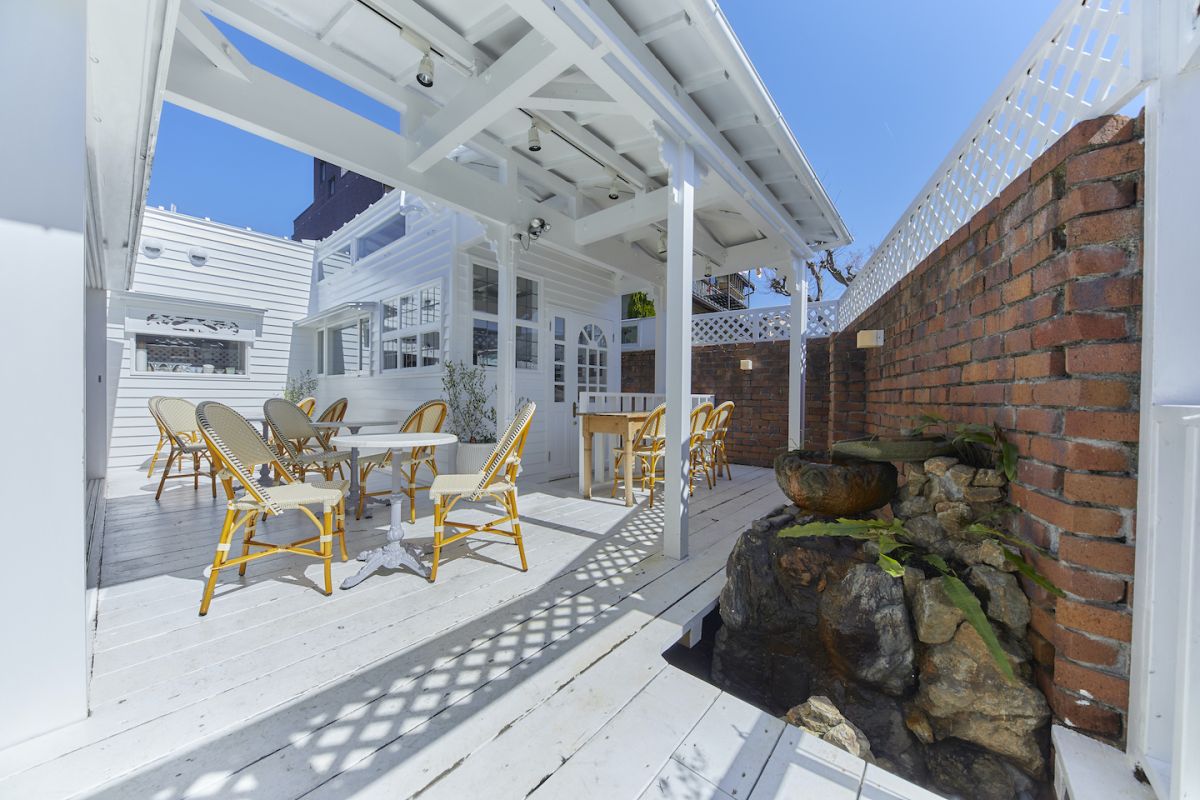 店内を抜けた奥にもテラス席がありますが、ここにはかつてお湯を沸かすおがくずを保存する燃料小屋とボイラー室があったそう。レンガについた煤がかつての様子を伝えます。