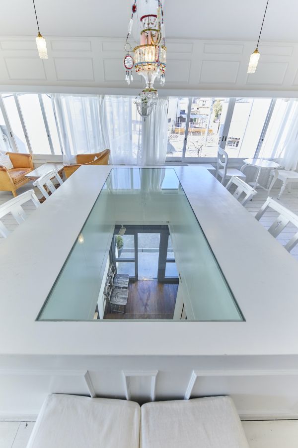 中央の大きなテーブルは天板にガラスが嵌め込んであり、1階の様子を垣間見ることができます。