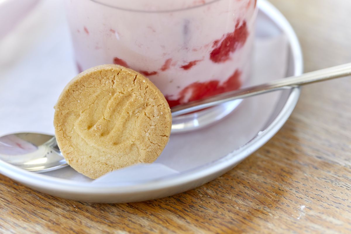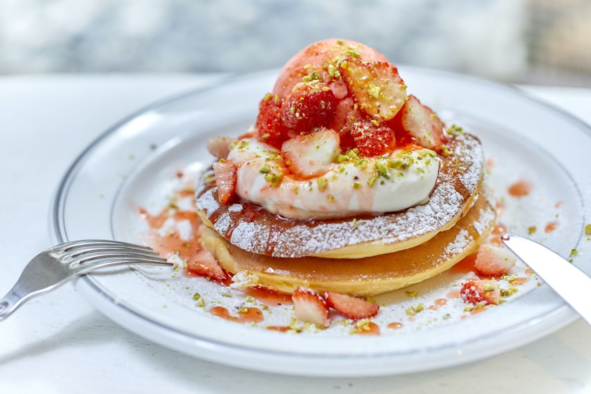 2段に重なったボリューム満点のパンケーキは、もっちりとした噛みごたえ。こちらもパンケーキとソルベの間にクリームの層があり、時間を置いてもアイスが溶けにくく、パンケーキの形も崩れにくくなっています。この素敵な雰囲気の中で撮影も楽しみたいと思うインスタ女子たちの気持ちに寄り添った気配りが嬉しいですね。