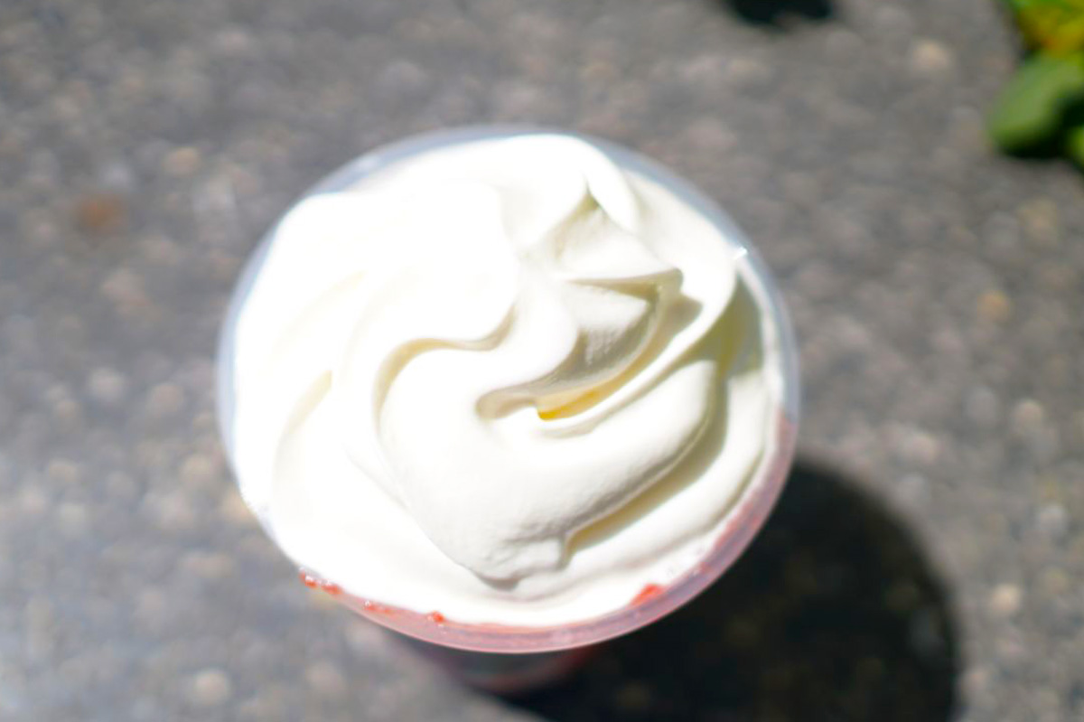 さらに、店員さんにおすすめされて、ストロベリーソースをブレンド(無料/ミルクと氷をブレンダーに入れるタイミングで、ストロベリーソースも投入すること)してもらいました。トライするなら、レジで注文する際に、「ストロベリーソースもブレンドしてください」と伝えてみてくださいね。