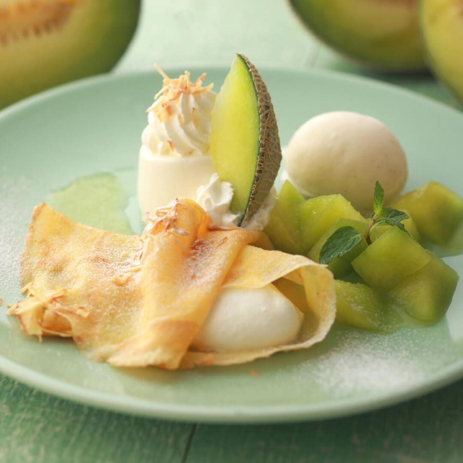 新作は、フレッシュメロン、バニラアイスを添えた「メロンクレープ・ア・ラ・モード」1430円。販売期間は2023年5月16日(火)~6月15日(木)で、ミルキーな味わいのパンナコッタとバター香る自家製のクレープが一度に楽しめる、ア・ラ・モード仕立てのデザートプレートです。香ばしくローストしたココナッツがアクセント。