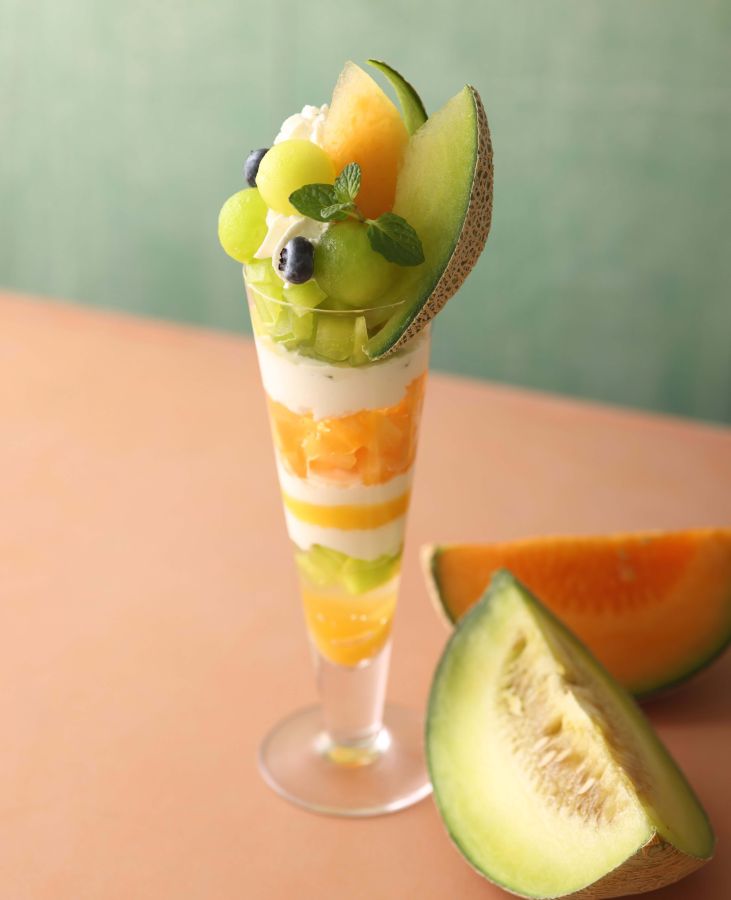 マイルドで上品な甘みと果肉感のある“赤肉メロン”、とろける甘みが際立つ芳醇な香りの“青肉メロン”、2種類のメロン果肉とマスカルポーネクリームなど重ねた「ダブルメロンパフェ」1760円。クレーム・シトロンの酸味が味を引き立てています。2023年5月16日(火)~7月18日(火)の販売です。