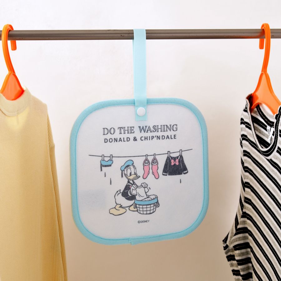 除湿シートは、お風呂に入るミッキーマウスとプルートや、服のお手入れをするミニーマウス、洗濯をするドナルドダックのデザインが施されています。旅行バッグの中やクローゼットに吊るしてかわいく除湿や消臭ができる便利なアイテムです。