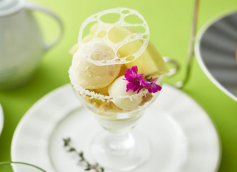 ココナッツのジュレやフレッシュメロン、クランブルなどが層をなしたグラスの上には、フレッシュメロン、バニラアイス、チーズムース、アメ細工がトッピングされています。見た目も味わいも爽やか!