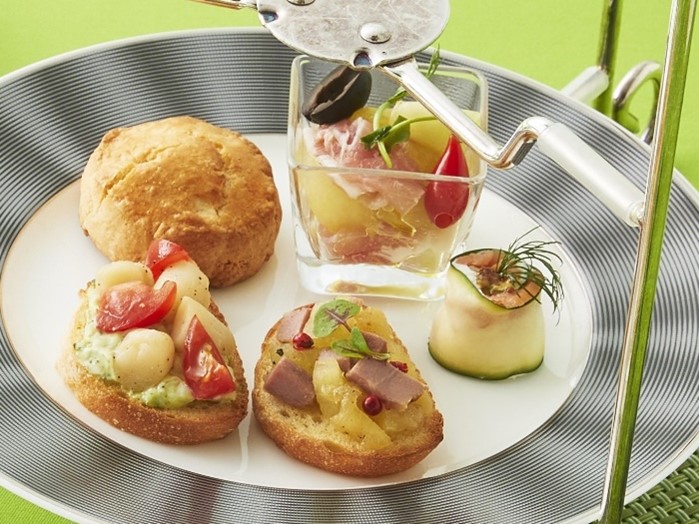 セイヴォリーにもメロンが使用されています。王道の生ハムメロンをはじめ、鴨とメロンのブルスケッタなど、満足感たっぷり!メロンシロップをレモンジュースなどと割ったバーテンダー考案のオリジナルドリンクも見逃せません。こちらのアフタヌーンティーセットは上段・中段・下段と贅沢な3段構成です。