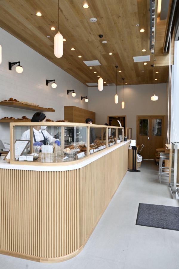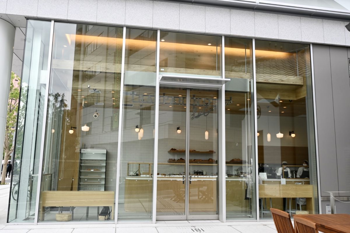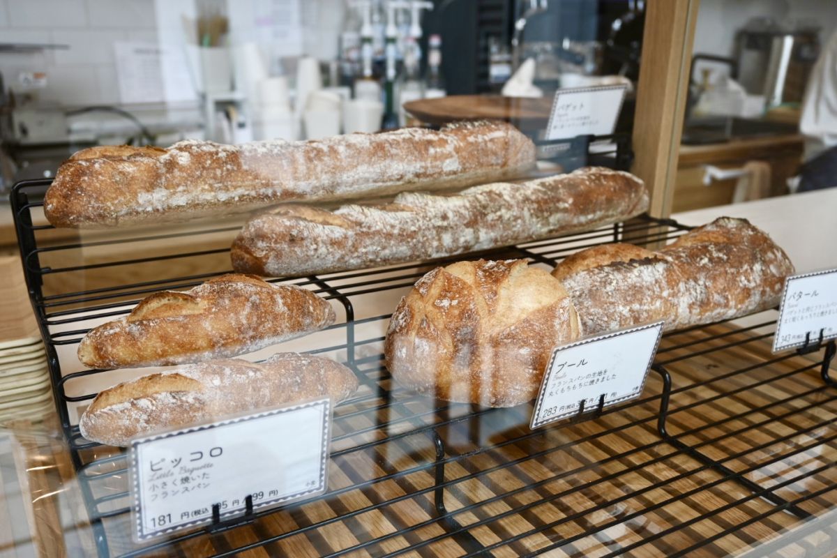 ショーケースに並んだパンを、口頭でオーダーするスタイル。外にはテラス席、店内にはカウンター席があるので、イートインもOKです。