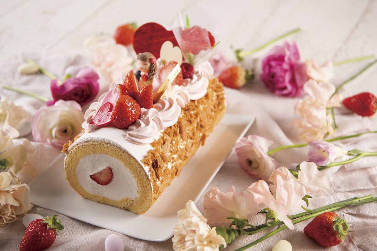 『パティスリー モンシェール』の「サンクスママロール(1本/直径約17cm)」3564円はイチゴ入りの堂島ロールをキュートにデコレーション。イチゴ、フランボワーズなどの色鮮やかなフルーツ、ハート型のチョコをトッピングし、仕上げに優しく微笑むお母さんとカーネーションを飾りました。