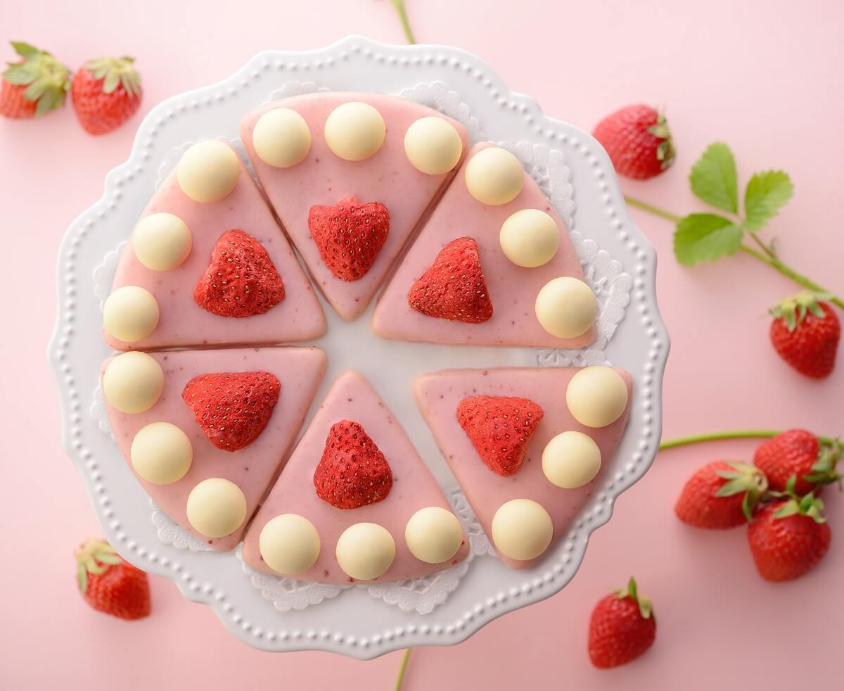 『ヴィタメール』の「ロゼ・ノーブル(1個/直径約10.5cm)」2916円は甘酸っぱいイチゴのムースを軽い口あたりのビスキュイで包み、チョコのフリルで飾り、ハートのショコラが添えられています。