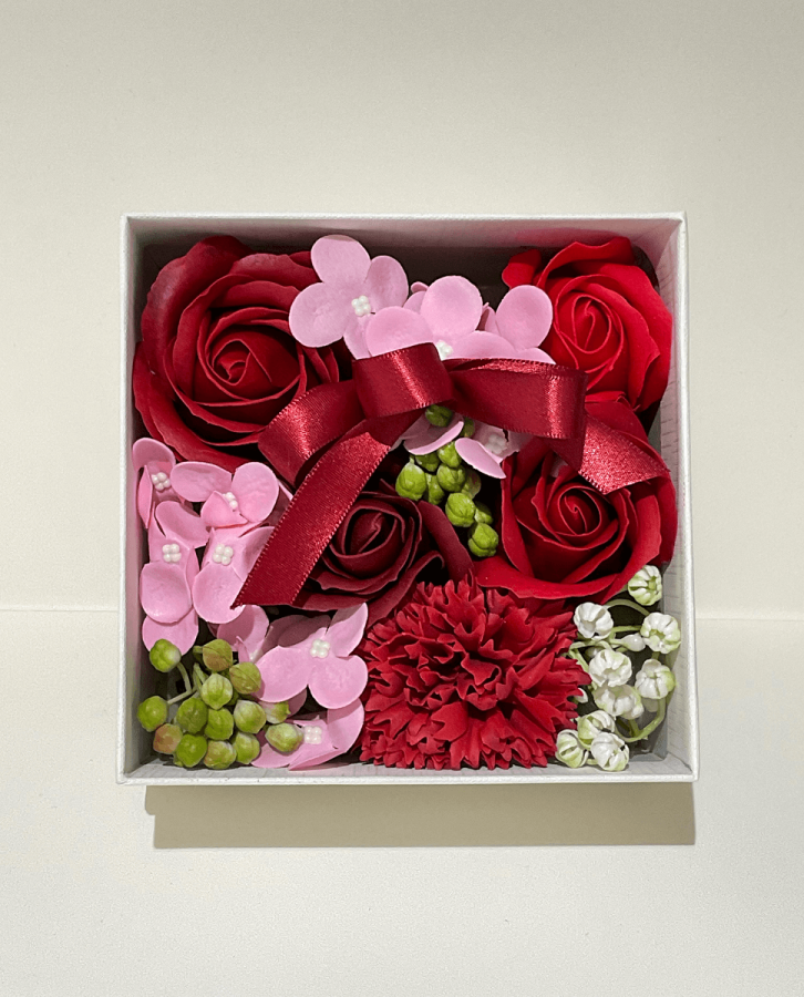 『美松フラワー』の「ソープフラワーBOXアレンジ」2530円はカーネーションやバラなど石鹸から作られた観賞用のお花のアレンジ。箱入りで飾りやすく、長く楽しめます。