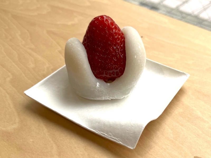 「いちご大福」は、大ぶりのイチゴがのったぜいたくな逸品。じゅわっとした果汁の酸味と、あんこの甘さがたまりません!こちらは季節限定で、今後はフルーツが変わっていくそう。次の来店時にどんなものになっているか楽しみが増えますね♪