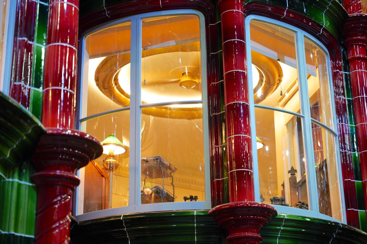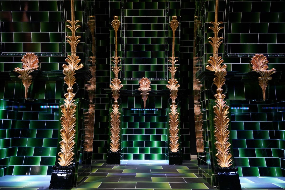 赤と緑のタイルが敷き詰められたセット内は約900㎡の広さを誇り、壁の高さは約9mとほぼ実物大のスケール。デザインはビクトリア朝建築からインスピレーションを受けており、印象的なタイルは6色に塗装されたあと、セラミックタイルのように見せるため、ラッカー塗装が施されたといいます。セット内に張り巡らされたタイルはその数約3万枚。撮影中、制作に最も時間がかかり、手のこんだセットのひとつなのだそうです。