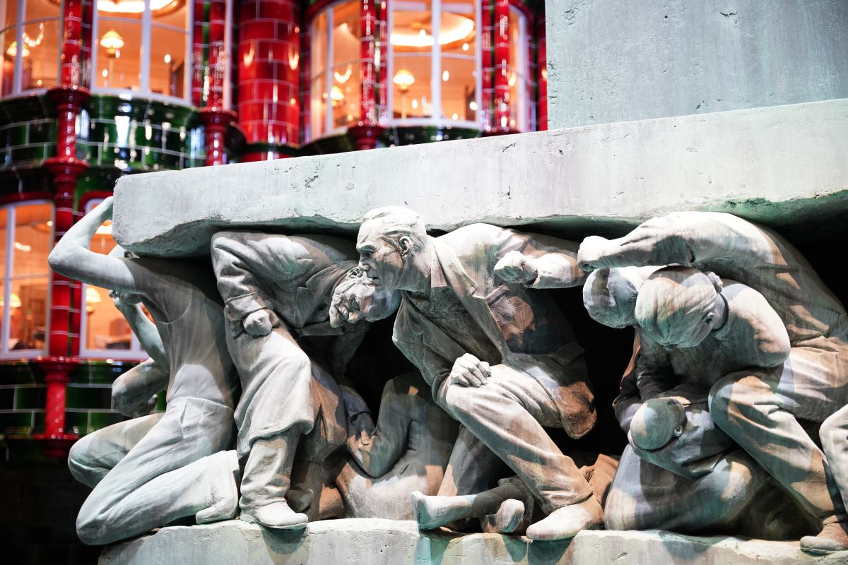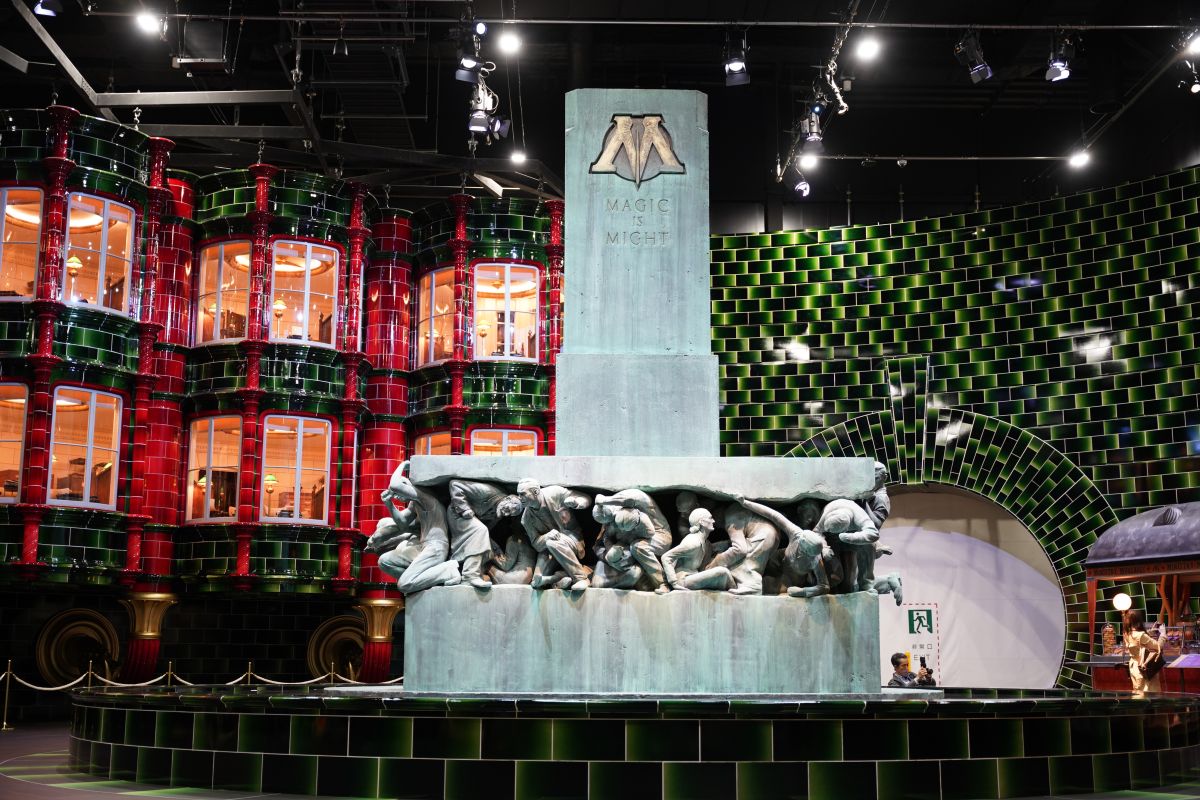 セット内中央にどんとそびえるのが、「Magic is Might(魔法は力なり)」と書かれた銅像。柱の下の台座には重さに押しつぶされるマグル(人間)像が58体並んでいます。こちらも一つひとつ手作業で掘り上げ、色付けしているのだそう。