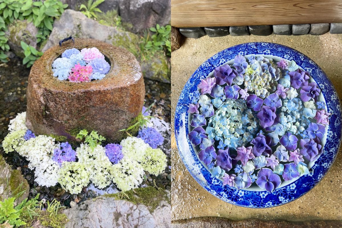 朝一番、花手水が美しいアジサイスポットへ/一条恵観山荘