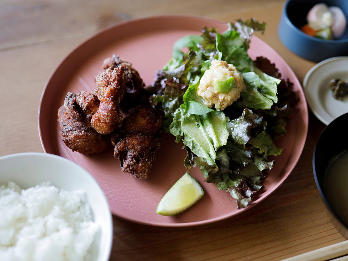 お楽しみのランチタイムを彩るのは、糀と米粉を使った国産地鶏の唐揚げ定食。