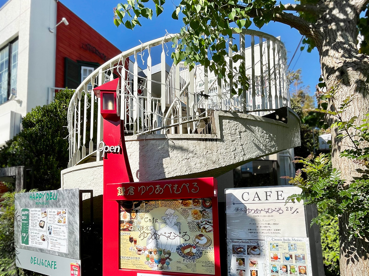 「英勝寺」から徒歩約10分。鎌倉駅付近にある「ゆりあぺむぺる 鎌倉」は、吉祥寺で愛される喫茶店の2号店。赤と白を基調とした、洋館のような佇まいが何とも魅力的です。