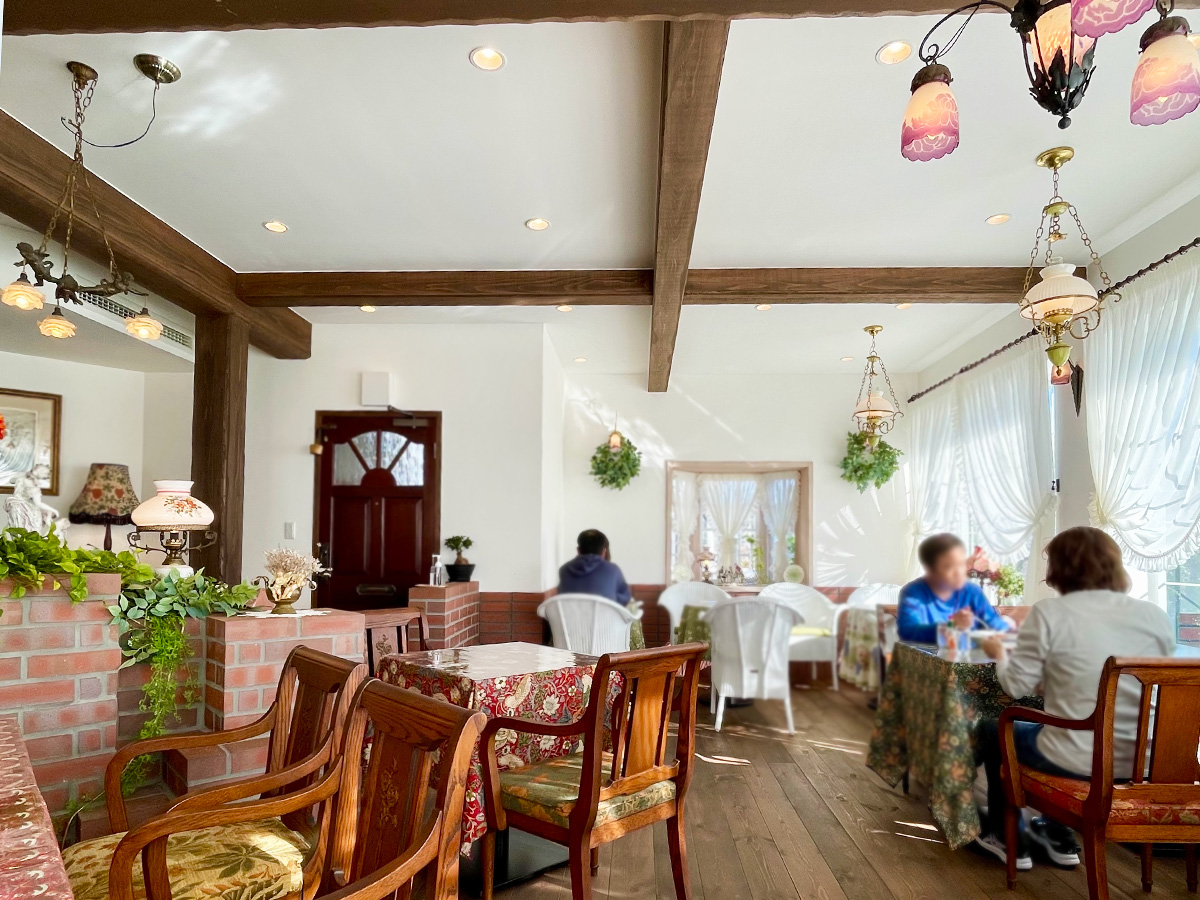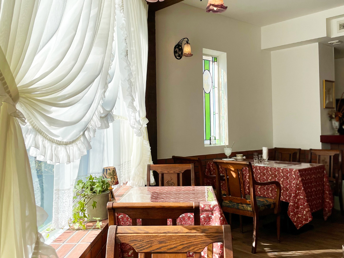 店内はレトロな洋館の雰囲気。実は、神社仏閣のほかに明治維新以降の西洋館が多く残る鎌倉。そんな歴史を感じさせる開放的な空間に、吉祥寺店と同じくアールヌーボー調の家具やクロスが合わさり、クラシカルな雰囲気に。