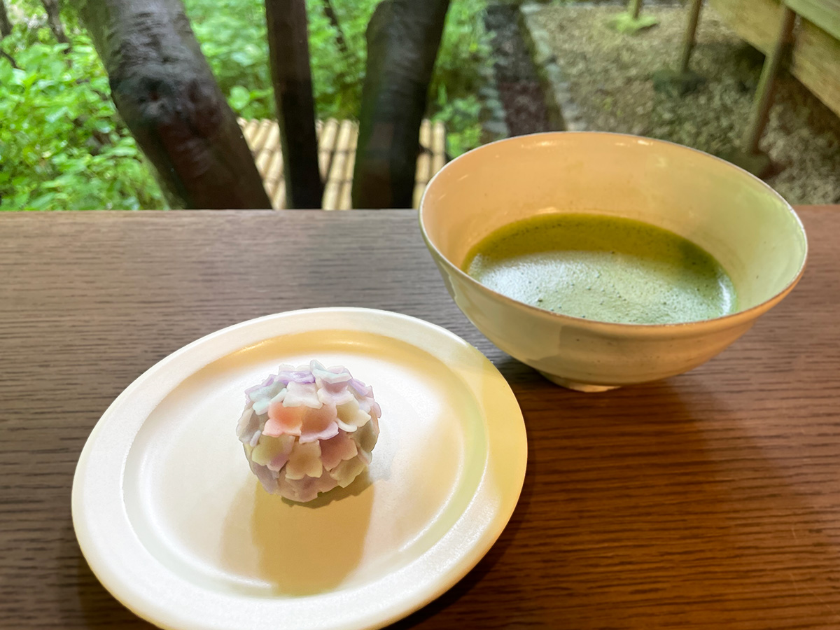 ここでは、都会の喧騒から離れ、アジサイが広がるすてきな景色や川のせせらぎ、上品な和菓子のおいしさ、抹茶の香りを五感で味わうことで、全身で安らぎを感じられます。非日常の時間を堪能できますよ。