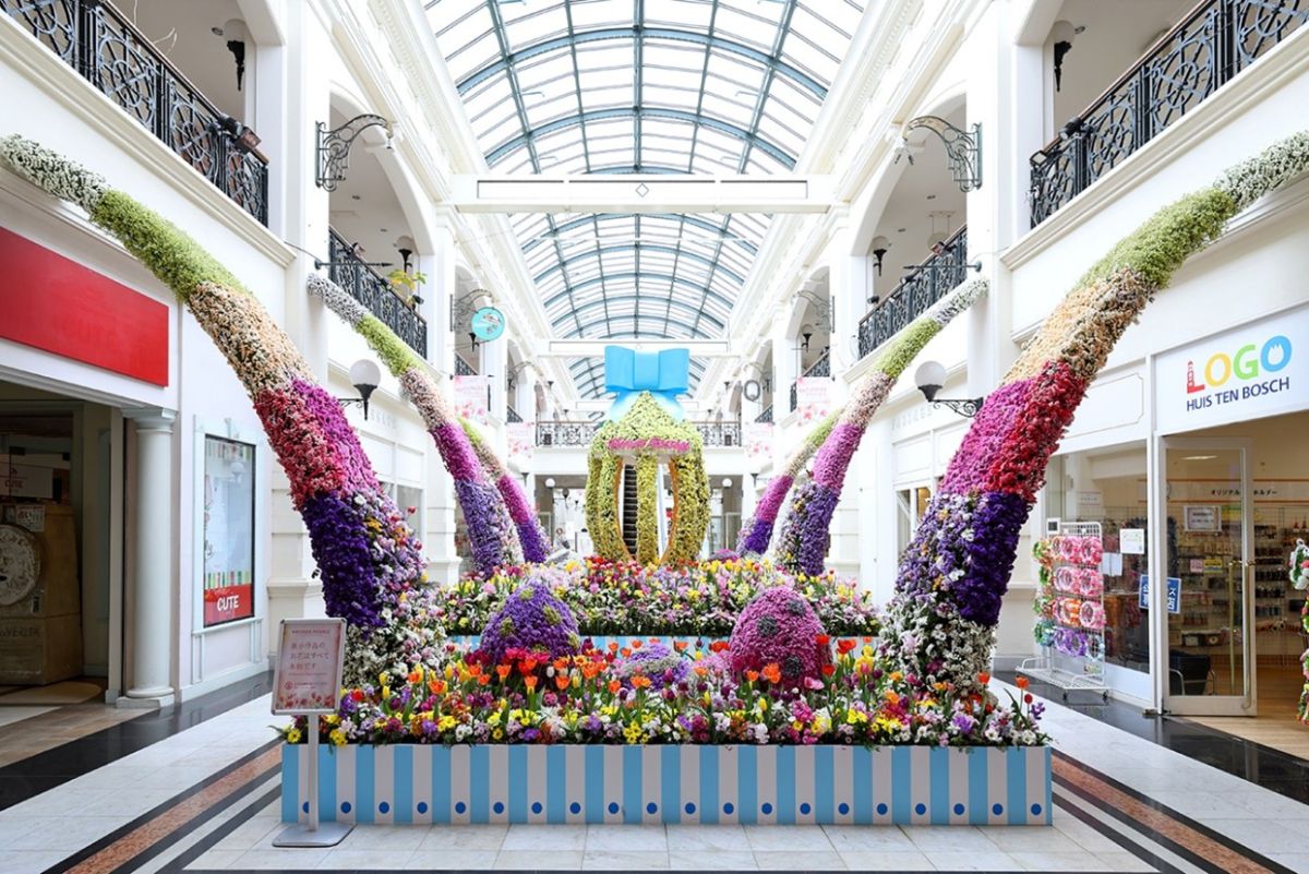 アンジェリケがあるのは、「アムステルダムシティ」とよばれるエリアのショッピングストリート「パサージュ」の一角。アーケード内に四季折々の花々が配された美しい空間で、季節の花々が鮮やかに咲き誇ります。