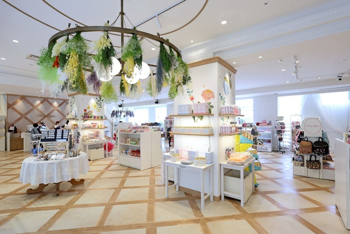 リニューアルしたアンジェリケの店内は、白とピンクを基調としたやわらかな雰囲気。華やかな装飾や花の香りに包まれてショッピングが楽しめます。
