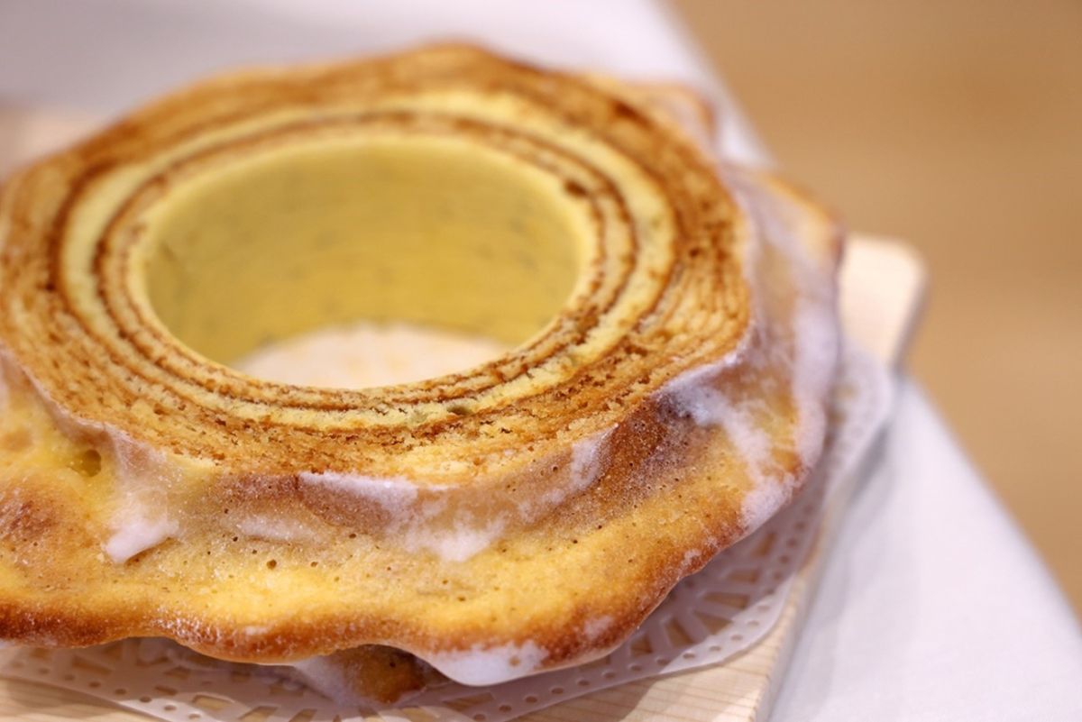 厳選素材を使った「プレミアムバームクーヘン」1600円もおすすめの一品です。バターの香る生地を何層も重ねて焼き上げ、外はサクッと香ばしく、中はしっとり。甘すぎず、小麦の風味をしっかり感じられる素朴な味わいがクセになります。