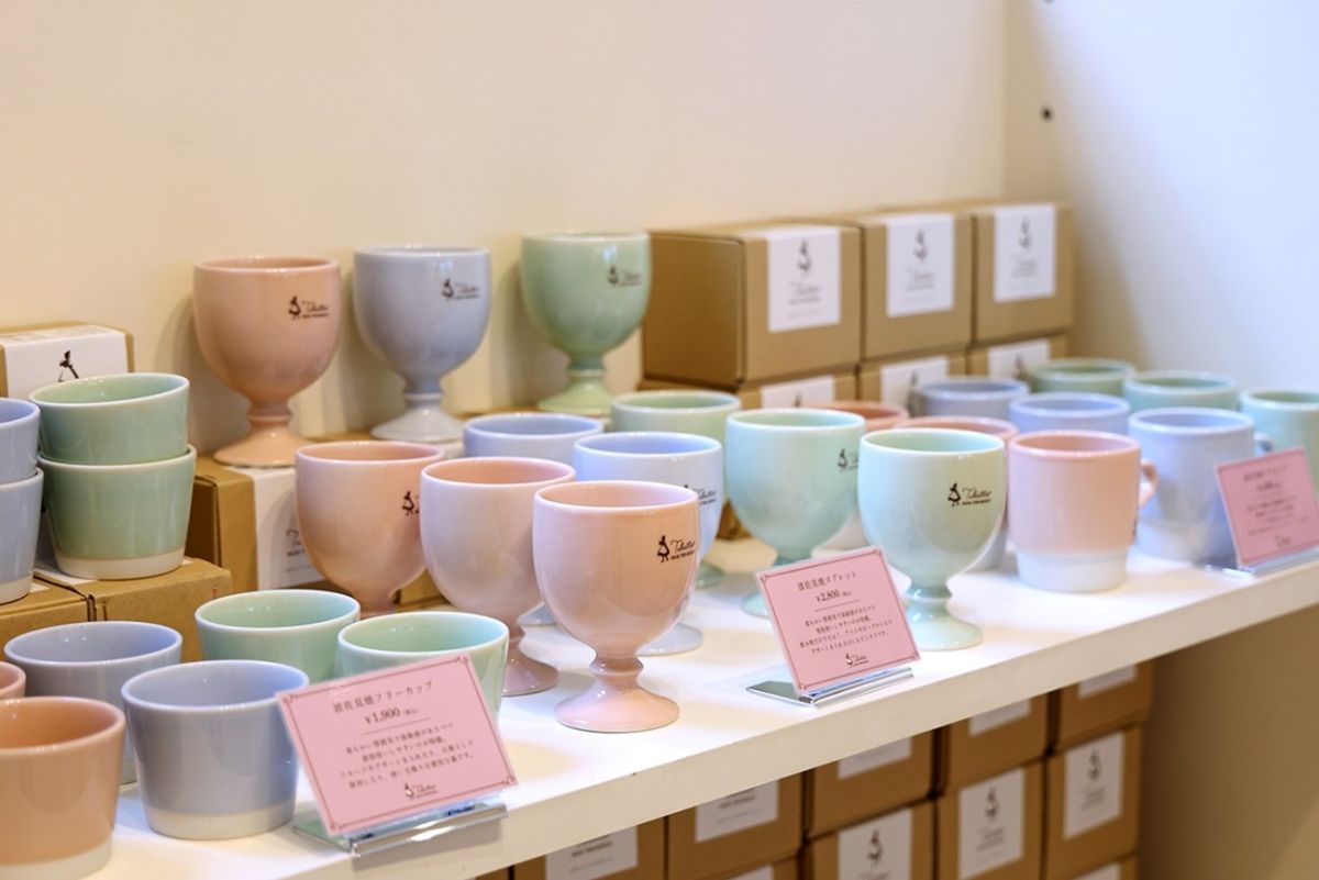 Tuliettaはスイーツだけではありません。棚に並んだカラフルで優しい色合いの陶磁器は、長崎県の伝統工芸品である「波佐見焼」。県内にある窯元「藍染窯(あいぜんがま)」と共同製作した「マグカップ」2300円や「ゴブレット」2800円などがあり、色はピンク、ブルー、グリーンの3色。高級感がありつつも値段は手頃で、日常を彩る焼物として普段使いしたい逸品です。