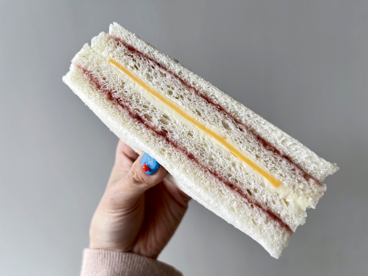 いちごジャムとチェダーチーズの組み合わせにちょっと驚きますが、チーズのほどよい塩気がいちごジャムの甘さを引き立たせ、後を引くおいしさ。