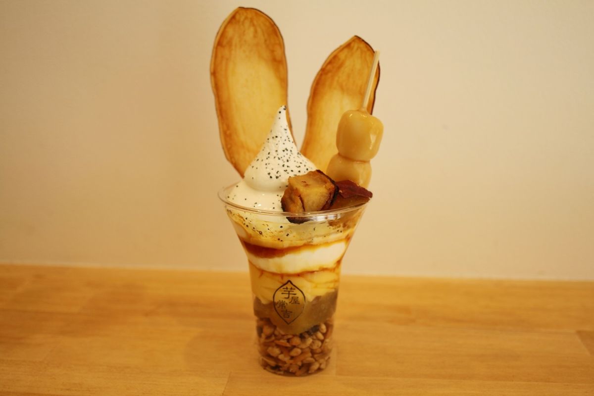 映えるお芋スイーツで人気なのが、「おいもパフェ」1200円!お芋チップスに、大学芋、芋けんぴ、みたらし団子と、お店のお芋スイーツがほとんど食べられるボリューミーな一品です。