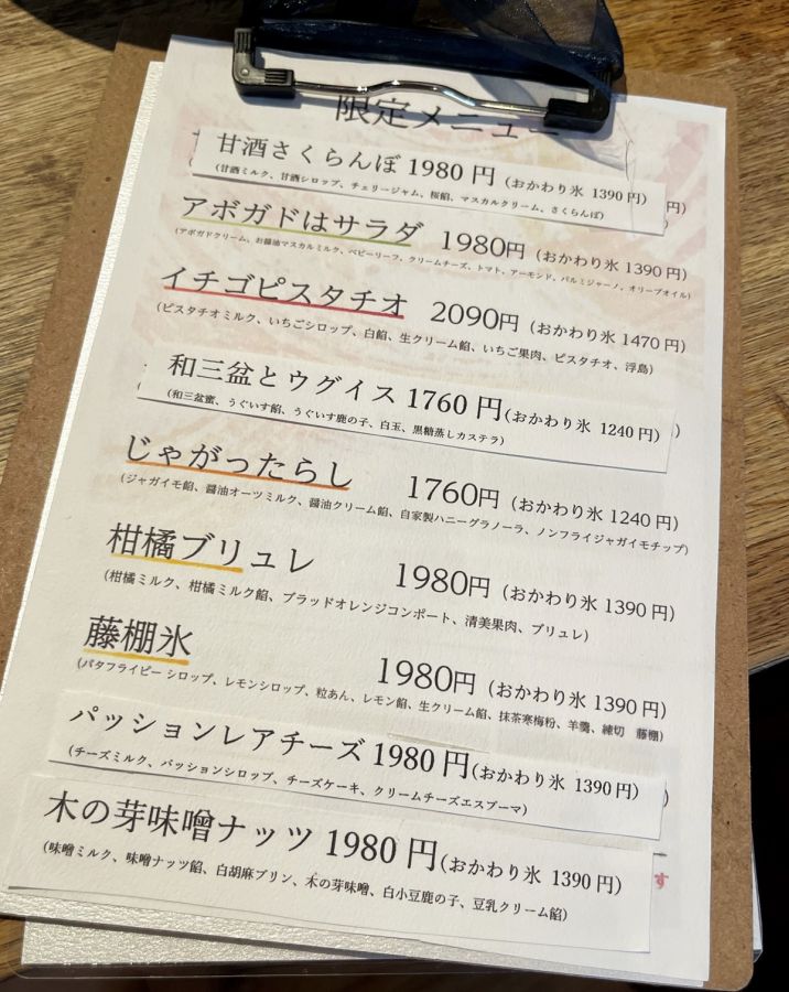 メニューは「一杯点て抹茶」と「和三盆練乳」の2種類の定番氷のほか、フルーツの旬に合わせてどんどん変わる限定メニュー、常時10種類前後がラインアップ。