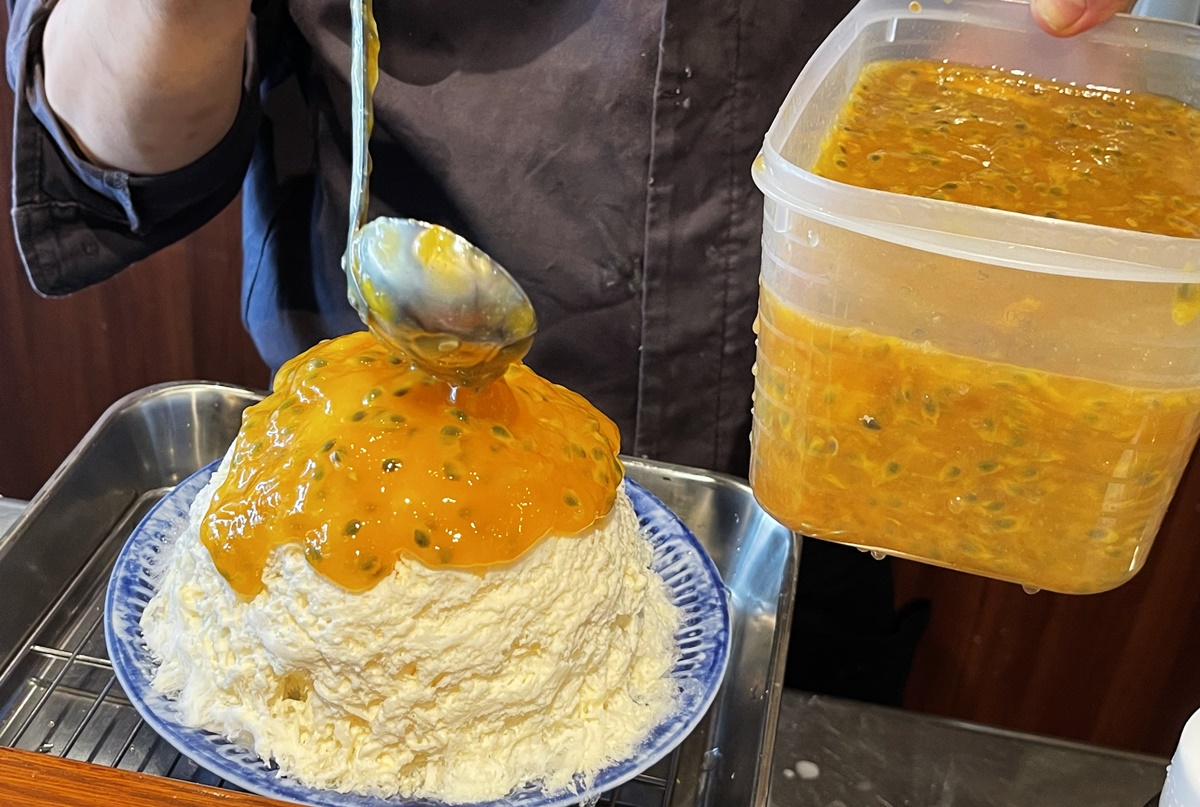 チーズミルク、パッションフルーツのシロップ、クリームチーズのエスプーマがトッピングされた見た目も華やかなかき氷です。