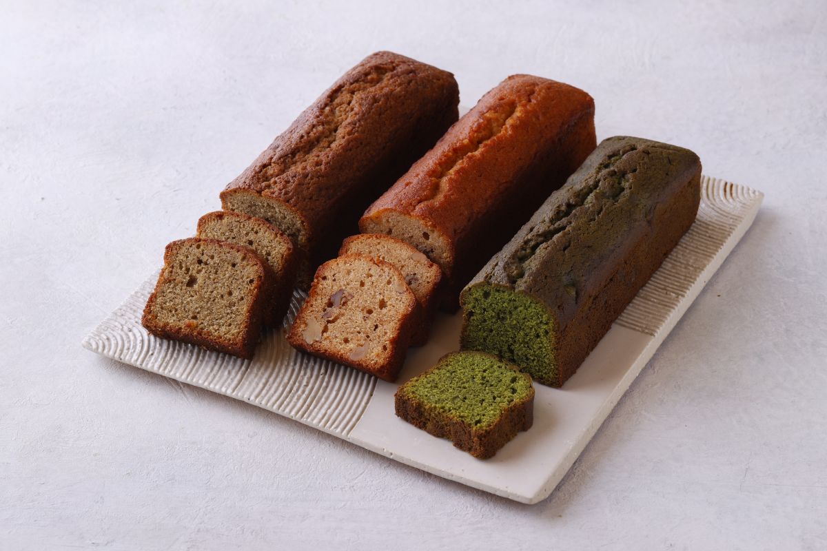 「パウンドケーキ」1本2800円、2本5000円、3本7000円は、北欧紅茶「セーデルブデンド」、胡桃シナモン 、抹茶とかのこ豆の3種のフレーバーを販売。1本からの購入も、お得な複数本のまとめ買いも可能です。
