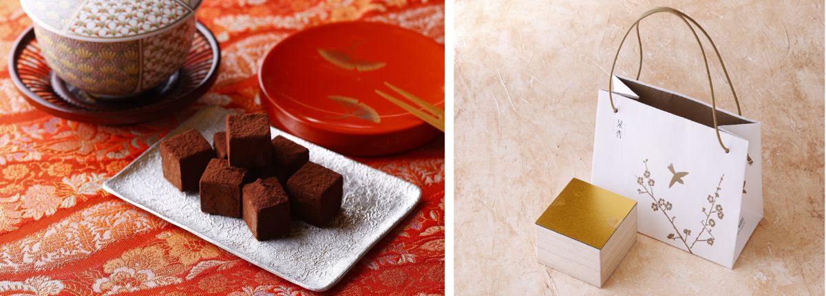 素材の魅力を引き出し、風味豊かに仕上げた「生チョコレート」各3000円もおすすめ。ホワイトチョコレートのガナッシュに、煎り胡麻と和三盆のパウダーをあしらった「黒胡麻」、モルトウィスキーを使用したガナッシュに、ウィスキーオークの香り付けをしたココアパウダーをあしらった「ウヰスキー」、抹茶のガナッシュに酒粕をブレンドした「抹茶酒粕」の3つのフレーバーが用意されています。なめらかな食感と口どけを楽しんで。