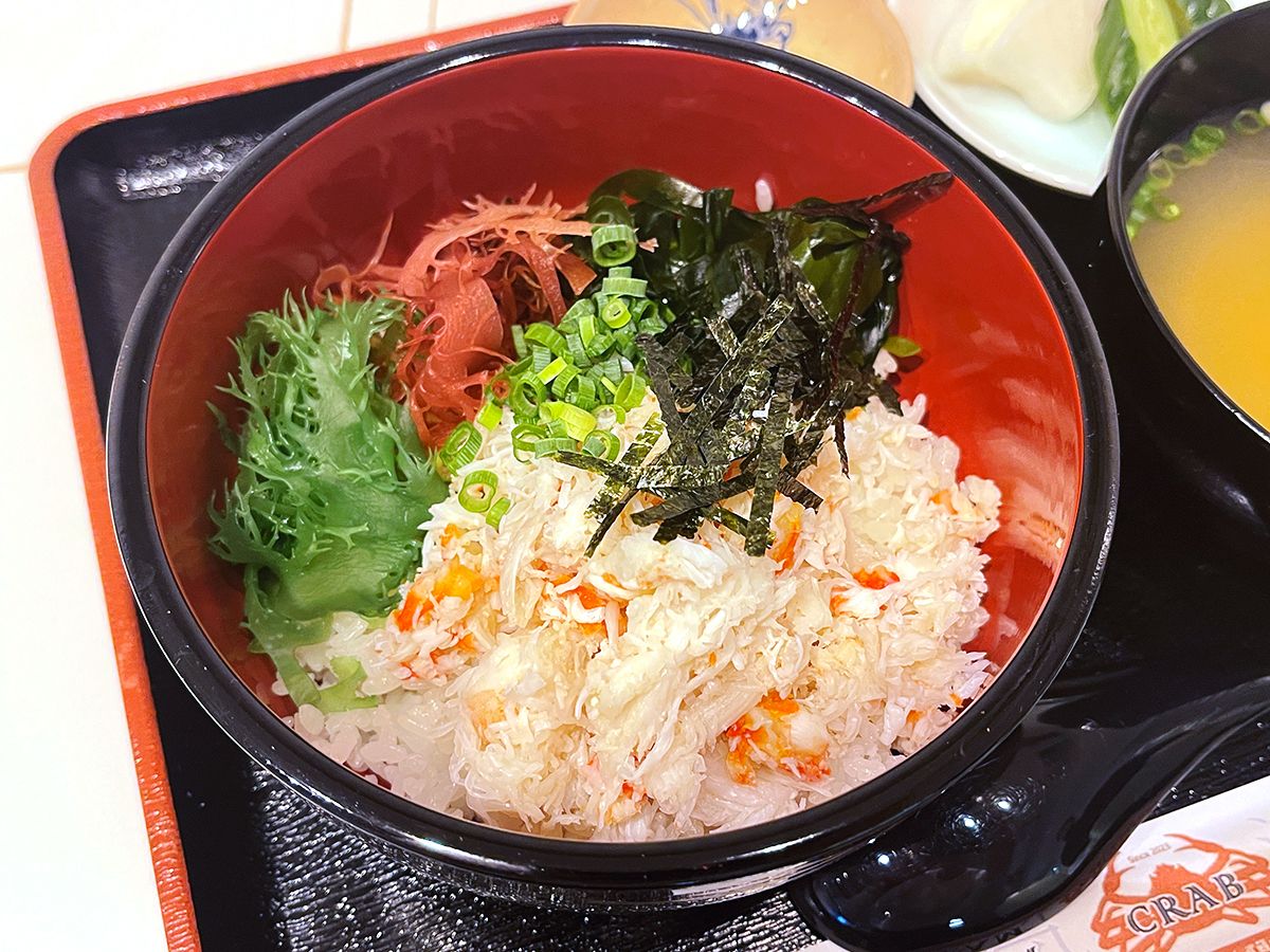 ズワイガニのほぐし身が贅沢に盛られた「蟹のほぐし身丼」は、カニのふんわりとした食感とうま味を堪能できる海鮮丼。カニでダシを取り、ほぐし身も入っている「蟹の味噌汁」と、お漬物がセットになっています。