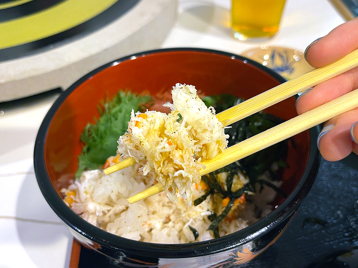 さっそくひと口いただいてみると、カニのほぐし身のふんわりとした食感に思わず笑みが。カニのうま味が口いっぱいに広がり、身はふっと溶けていくので、もう箸が止まりません!