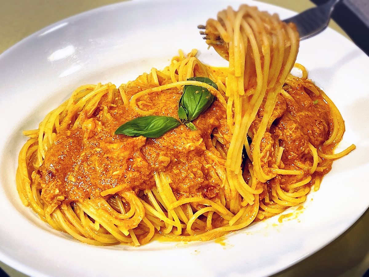 こちらは、たっぷりと自家製ソースがからめられた「蟹トマトクリームパスタ」。ランチタイムでは、ミニサラダがセットになります。