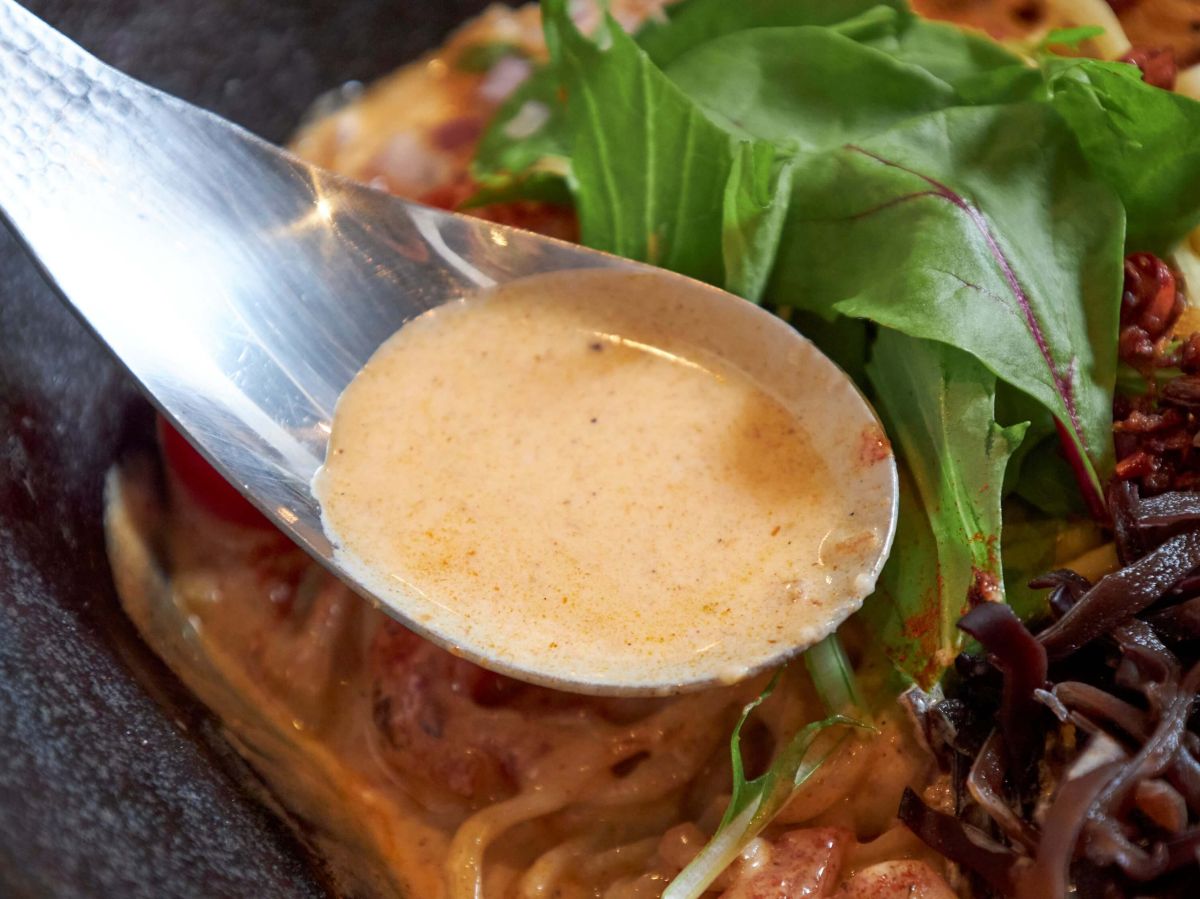 スープのベースは先ほどと同様に、濃厚な“和風だし+有機豆乳”です。そこに自家製のラクサペーストとココナッツミルクをプラス。豆乳だけでなくココナッツミルクも入っているので、辛さは残しつつもマイルドに仕上がっています。