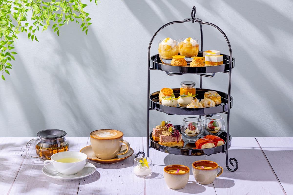 ティースタンドには、クリームチーズを贅沢に使用し、爽やかなサマーフルーツのソースを添えた「ベイクドレアチーズ アプリコットとパッションフルーツソース」や、フルーツをふんだんに使った人気のミニロールケーキ、メレンゲの軽やかな食感と爽やかなライムクリームが特徴の「ライムとココナッツのミニタルト」など、初夏にさっぱりといただける人気のスイーツばかりがラインナップ。