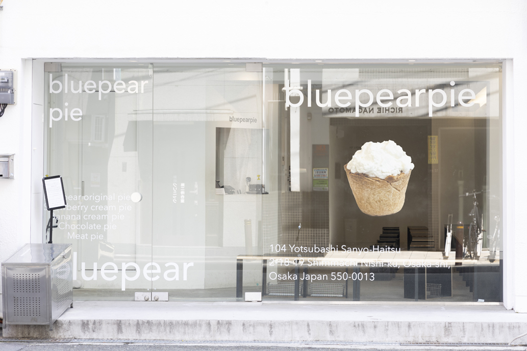 堀江エリアの北側にある西大橋駅1番出口から徒歩4分ほど。「ここです」と言わんばかりの大きなパイの写真が目を引くこちらが、パイ専門カフェ「bluepearpie」です。行列が絶えない韓国カフェ「bluepear Coffee/Photo」の姉妹店として2022年7月にオープンしたパイ専門店で、こちらも大人気。