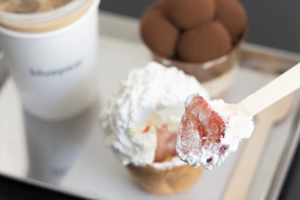 手前は「ストロベリークリームパイ」880円。中には、下からホイップクリーム、カットイチゴ、カスタードクリーム、最後に再度ホイップクリームをたっぷりオン。パイ生地は、しっかりとした食感で、小麦の風味豊かな仕上がりになっています。濃厚なふわふわホイップやごろりと入るイチゴと相性抜群です。