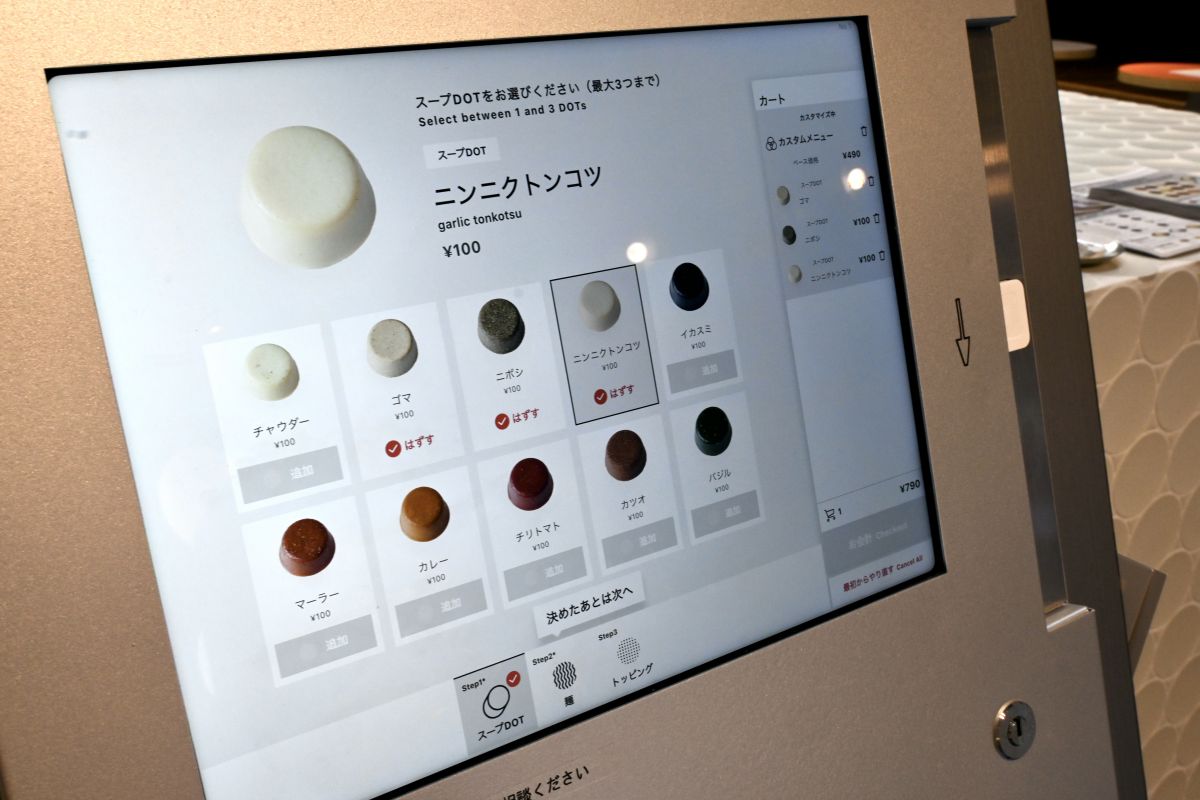 オーダーはタッチパネルから。まずは独自開発のスープの素「スープDOT」を「チャウダー」「マーラー」「ゴマ」「カレー」「ニボシ」「チリトマト」「ニンニクトンコツ」「カツオ」「イカスミ」「バジル」の10種類から1〜3種類を選びます。次に麺、トッピングを選んでお会計をすれば、ロボットが調理をスタート。
